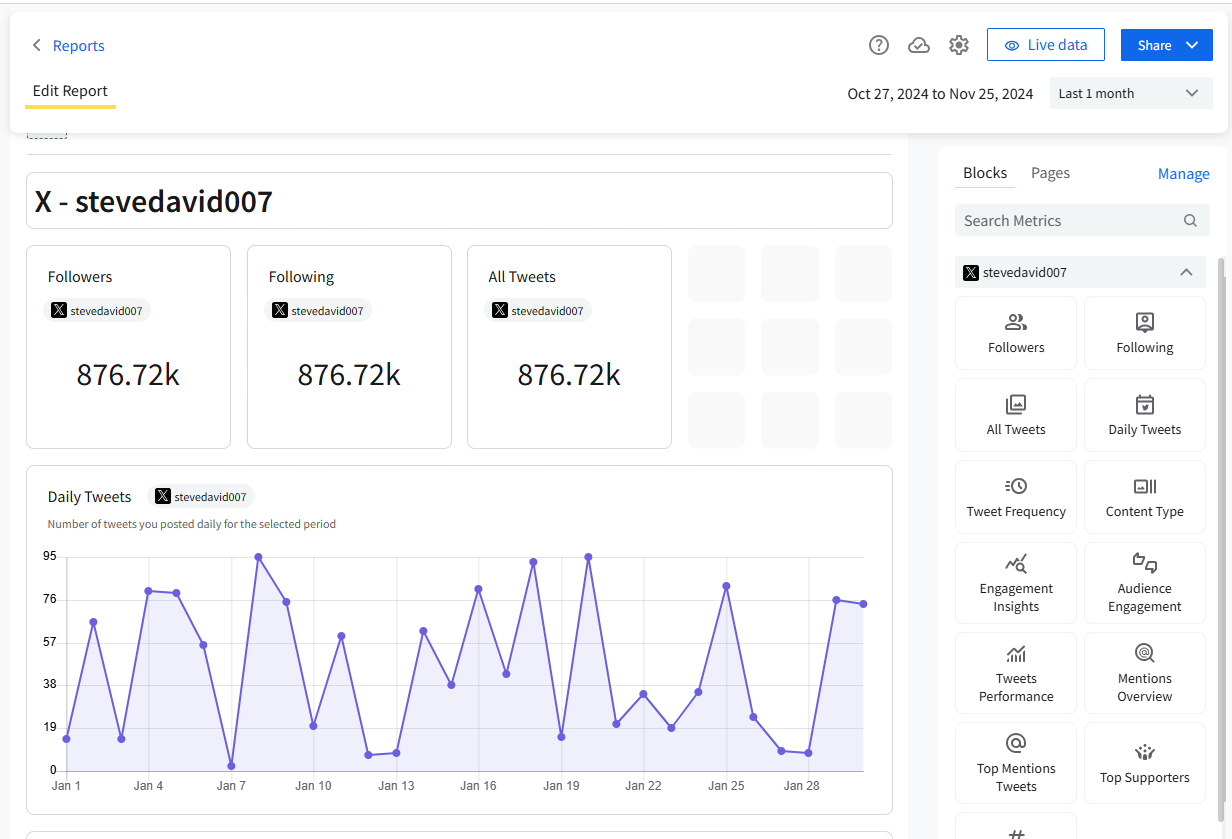 Along with setting up multi-platform reports, you can also customize the analytics for individual accounts under the platform-specific analytics dashboard. The classic analytics dashboard enables you to track real-time analytics for individual accounts and generate downloadable, shareable reports from the same space.