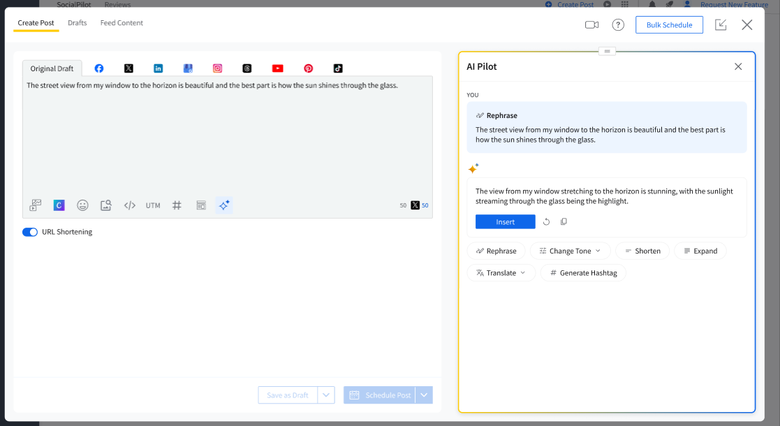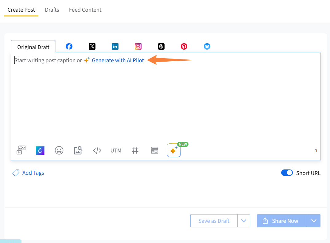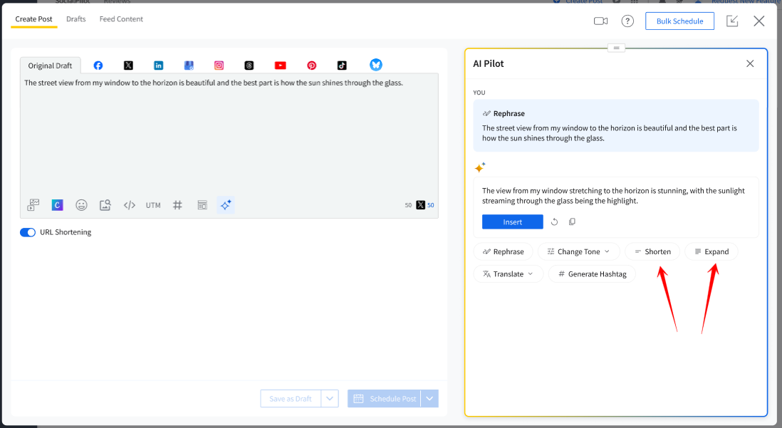 If you are working on a platform with specific character limits (like Twitter, Pinterest, or Bluesky), AI Pilot will ensure that the generated content fits within those limits. Use the Shorten or Expand option to trim content, as needed.