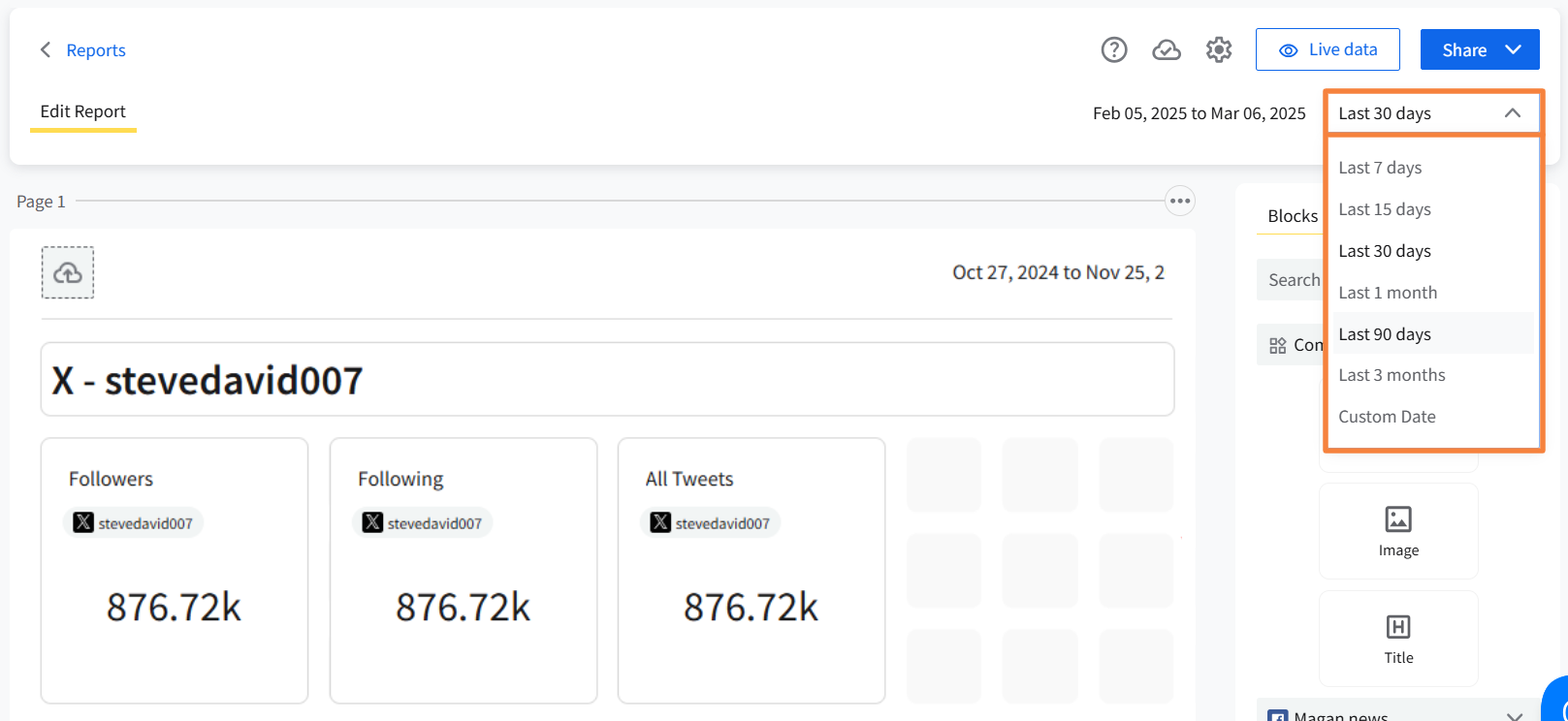 First and foremost, you must select the time period the report will cover. To customize the date range of the report, select the date drop-down below the Share button and choose the required option.