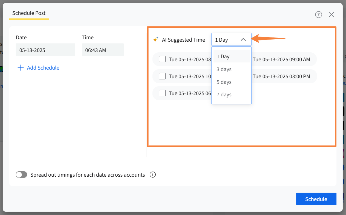 The AI-suggested times will be visible by default for one day. You can go to the dropdown menu and see two time slots to post for the next 3 days, 5 days, and 7 days.