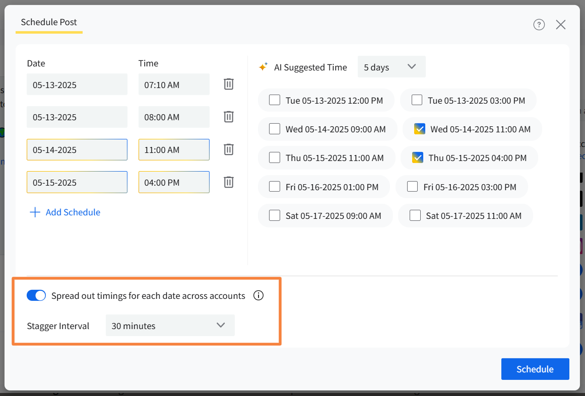 If you have selected multiple accounts to publish the post, move the toggle button to activate staggered posting. Designate the interval between publishing times for each account.