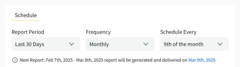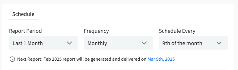 Note: If you have selected a Report Period with days rather than months, you will be able to see the actual date that the scheduled report will cover.