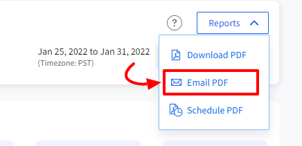 To share PDF report via email, first access the report you want to share, default or custom. Then click on the Email PDF button on the top right-hand side.