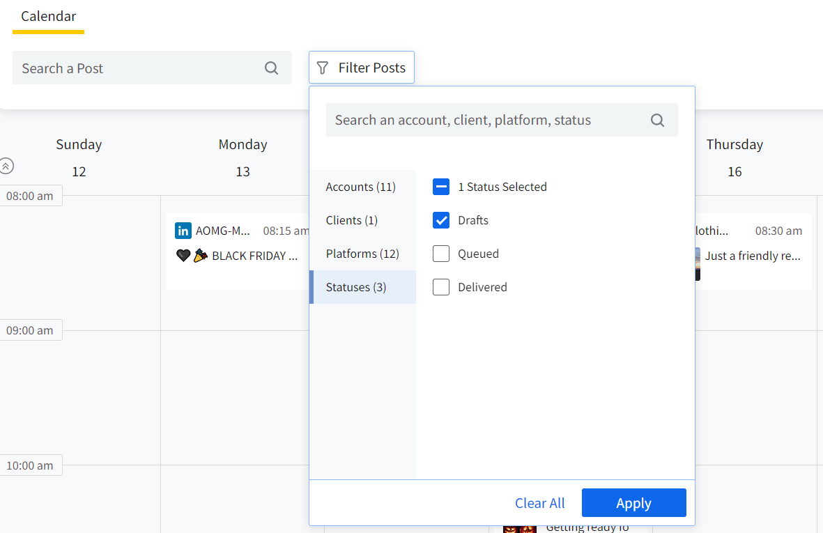 There are filters available on the calendar that can help you see posts based on their STATUS, including Queued, Delivered, and Draft.