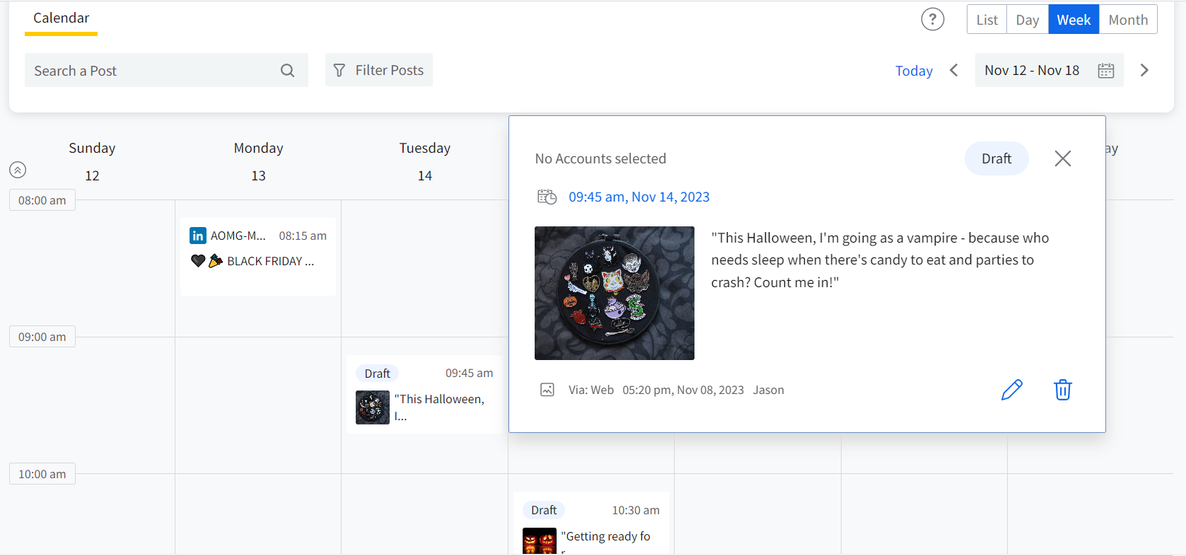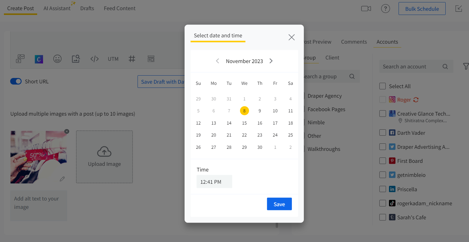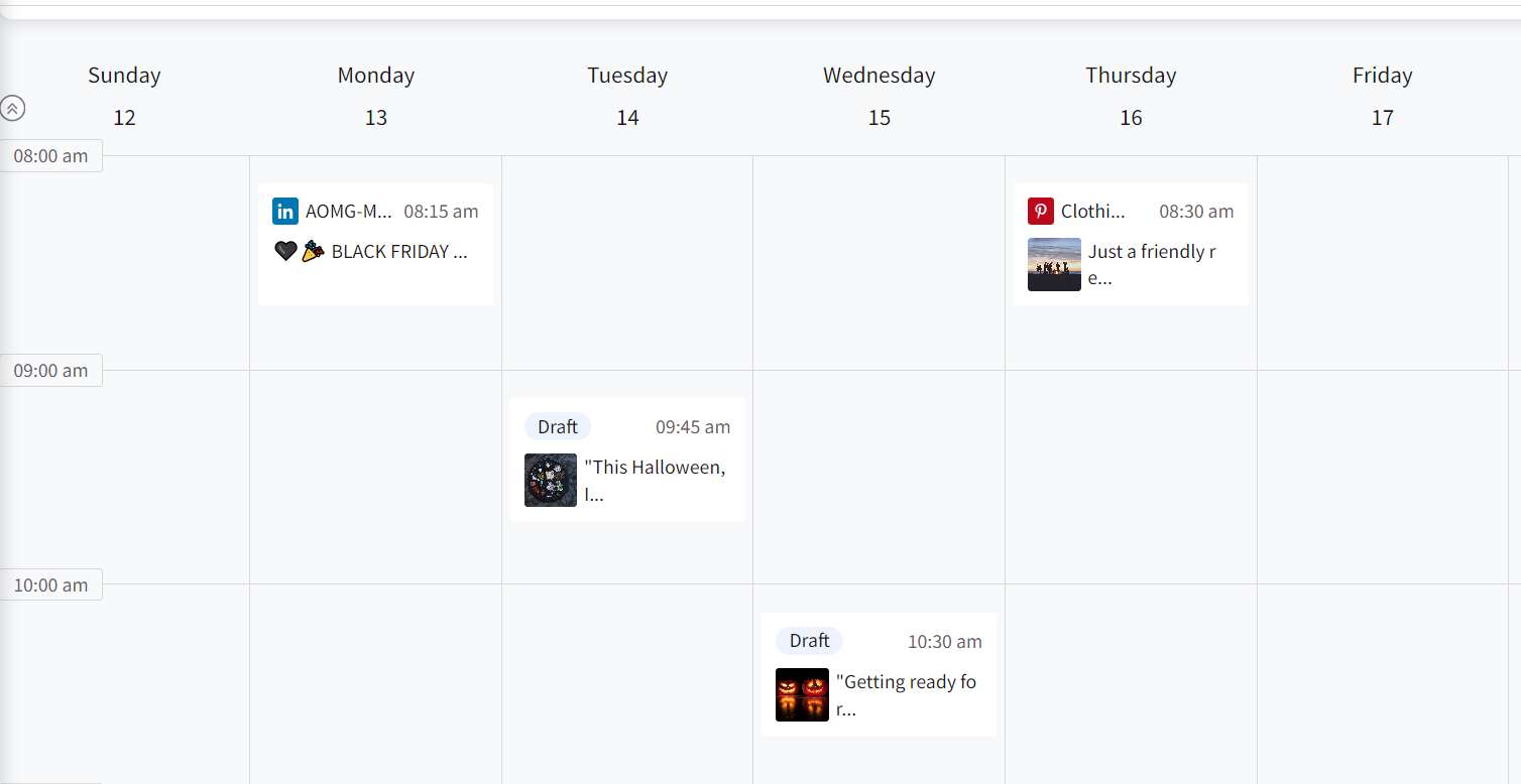 Saving drafts with specific dates enhances your content planning and organization. This feature allows you to see all drafts, queued, and published posts in a unified calendar view.