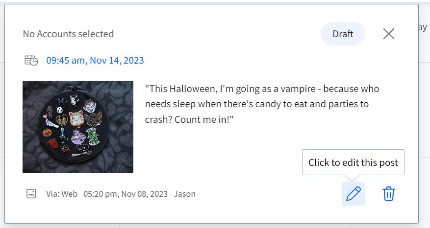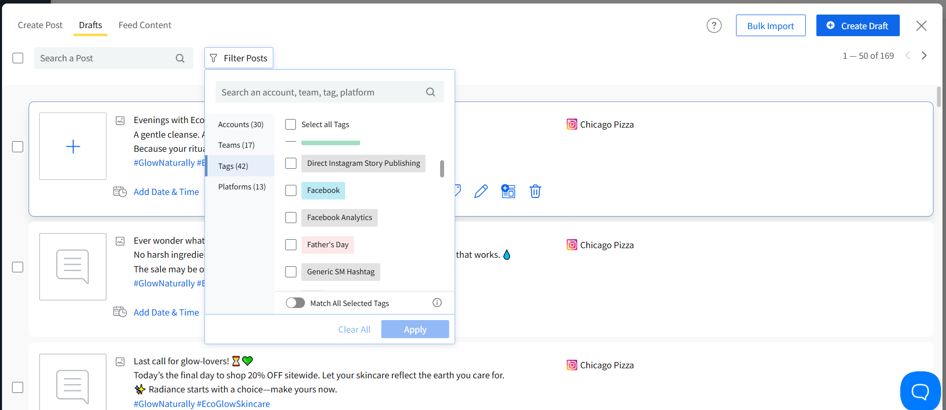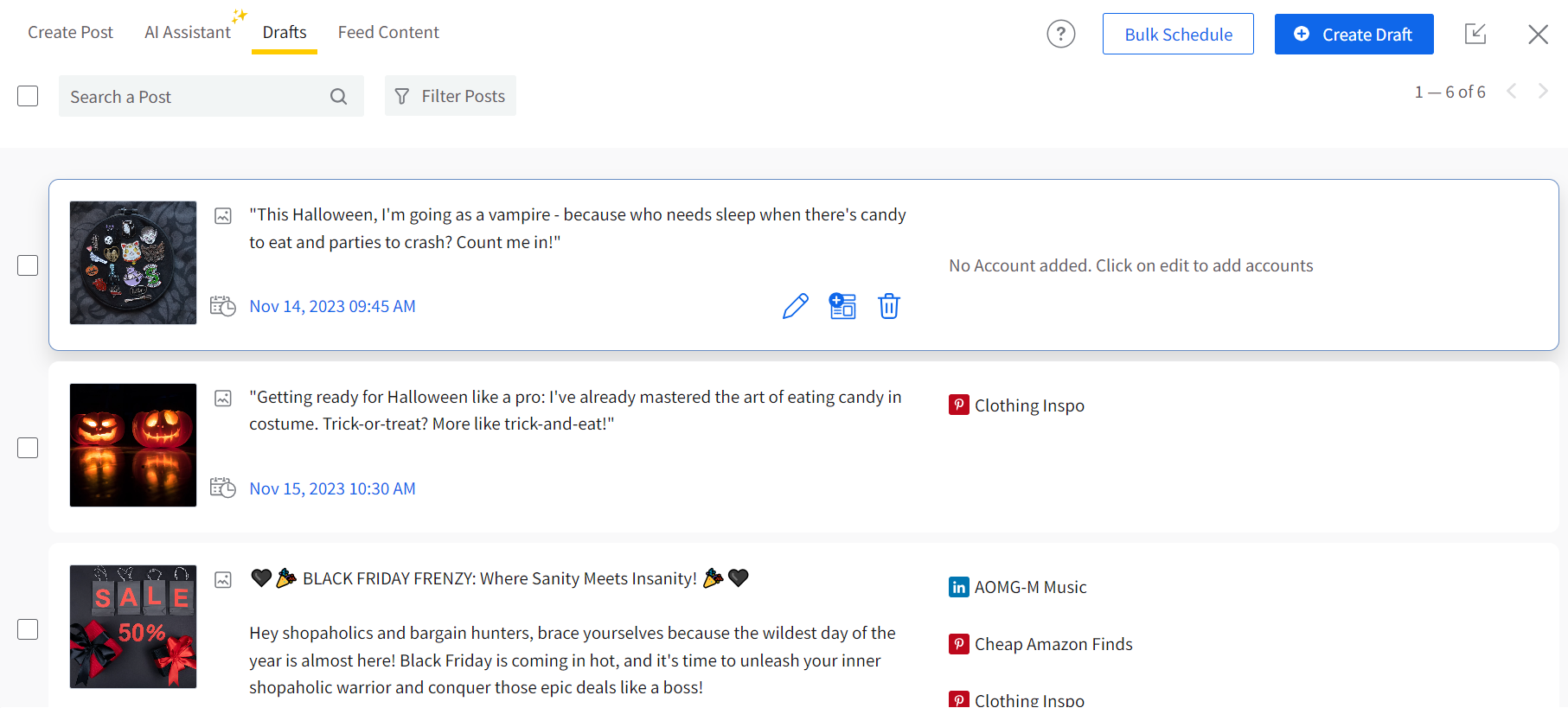 Saving drafts with specific dates enhances your content planning and organization. This feature allows you to see all drafts, queued, and published posts in a unified calendar view.