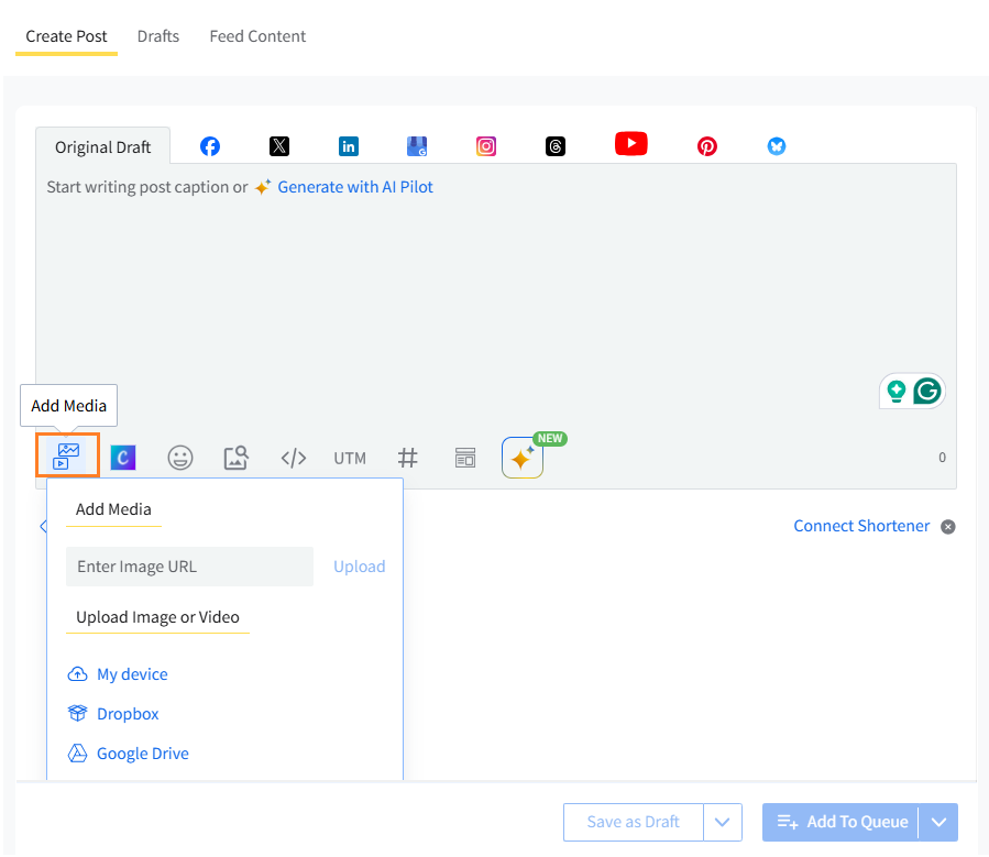 Click the Add Media icon to select an image from Google Drive, Box, Dropbox, or by entering an image URL. You can also choose an image from a site/blog link pasted in the text box or use stock images available via the Unsplash integration.