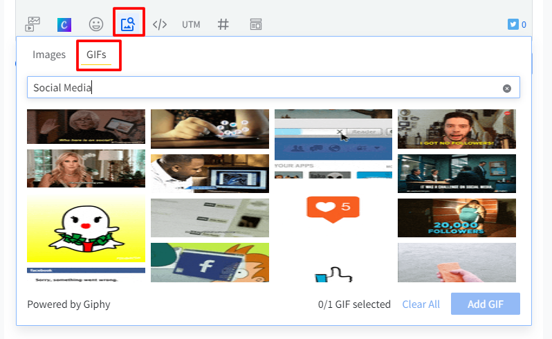 Add GIFs to your posts by clicking the Add media from external source button and switching to the GIF tab. Select a GIF from the options available.
