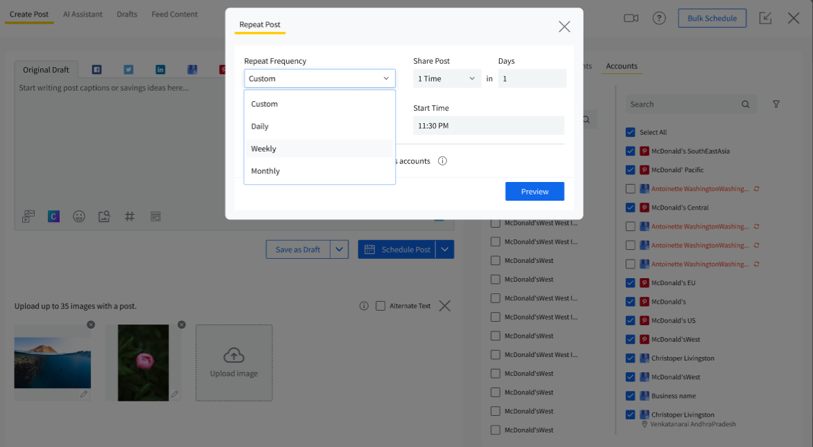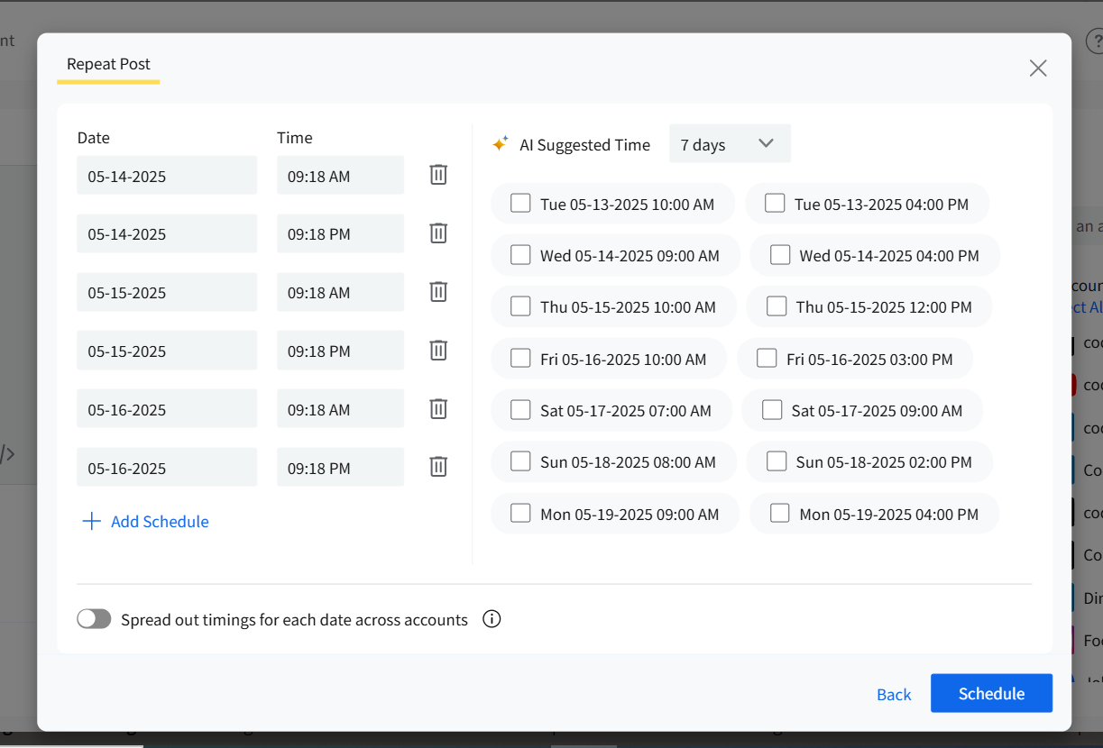 Click Preview to view and adjust the dates and times for each repetition. If you are posting to multiple accounts, you can stagger the posting time for each account to avoid simultaneous posts across platforms. You can also select AI-suggested times to get the best results from your post.
